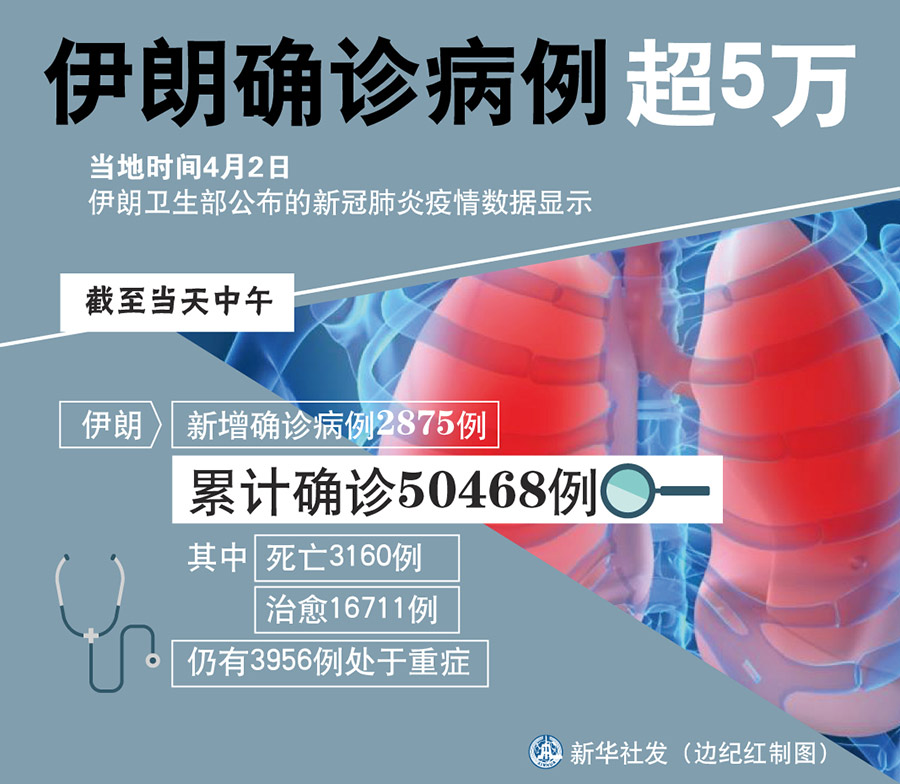 新华社德黑兰4月2日电(记者陈霖)伊朗卫生部2日公布的新冠肺炎疫情数据显示,截至当天中午,伊朗新增确诊病例2875例,累计确诊50468例,其中死亡3160例,治愈16711例,仍有3956例处于重症。
