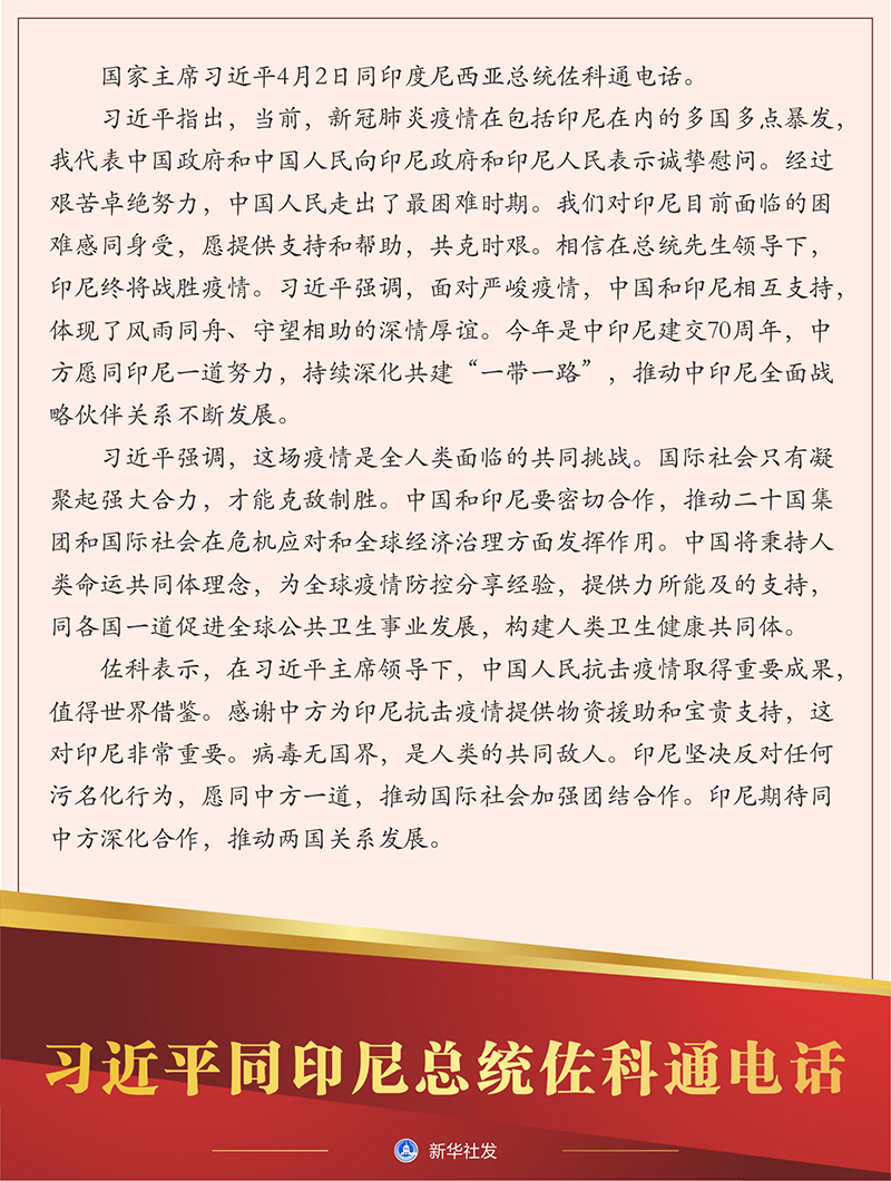 新华社北京4月2日电 国家主席习近平2日同印度尼西亚总统佐科通电话。