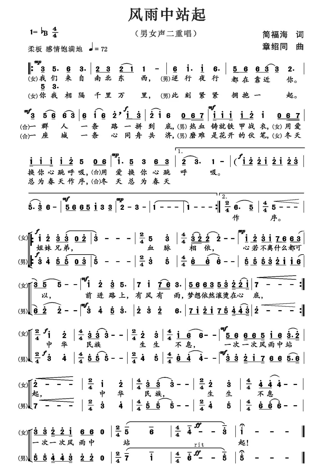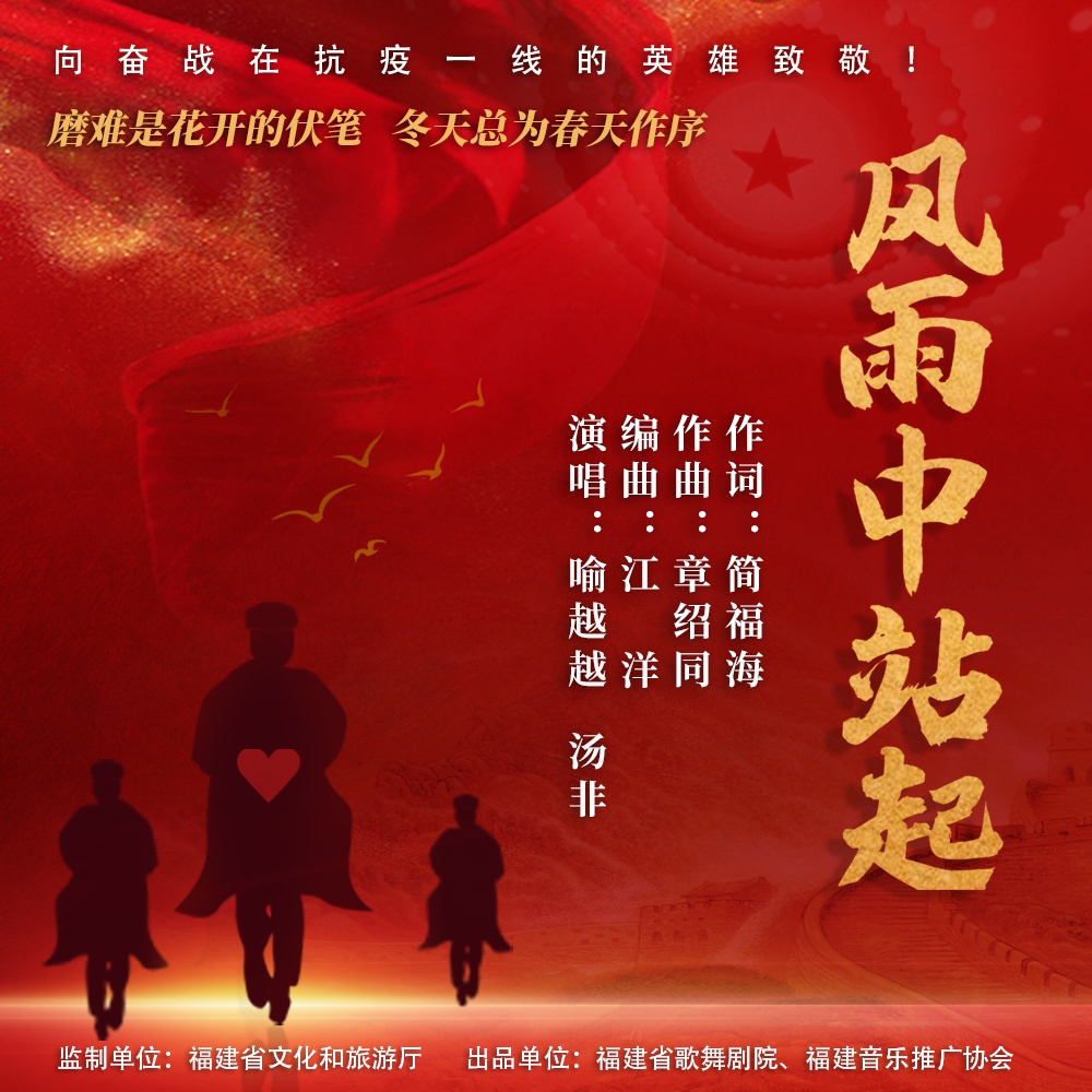 近日,由简福海作词,著名作曲家章绍同作曲,知名音乐制作人江洋编曲,著名青年歌唱家喻越越、著名青年歌唱家汤非联袂献声的公益歌曲《风雨中站起》正式上线。该歌曲由福建省文化和旅游厅监制,福建省歌舞剧院和福建音乐推广协会出品。