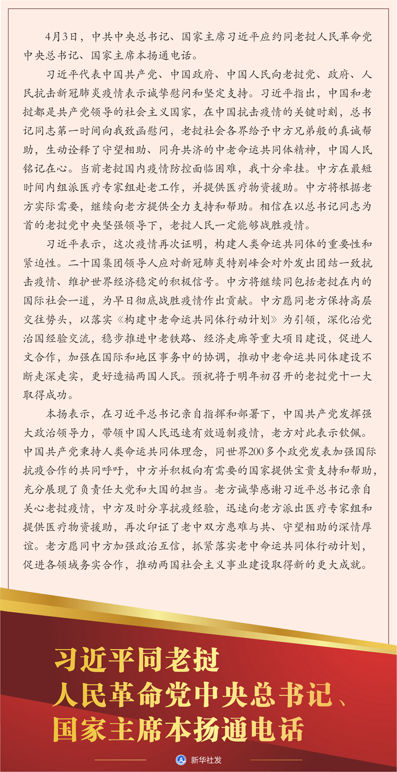 新华社北京4月3日电 4月3日,中共中央总书记、国家主席习近平应约同老挝人民革命党中央总书记、国家主席本扬通电话。