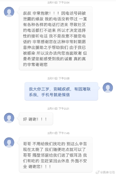 后来,老人每天打电话给所有跟他联系过的志愿者,说需要什么物资。而当他们定期回访其他求助者时,大部分人都会说,不需要帮助了,谢谢你们。楼威辰渐渐觉得老人自私贪婪,就不再接电话了。