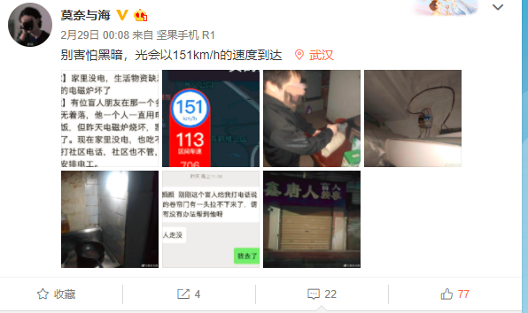 2月28日晚上10点多,楼威辰收到一项特殊的求助。一个独居盲人张磊(化名)因电磁炉烧坏导致跳闸停电,无法做饭,打电话给社区,社区说暂时没法安排电工,只好通过朋友在网上求助。