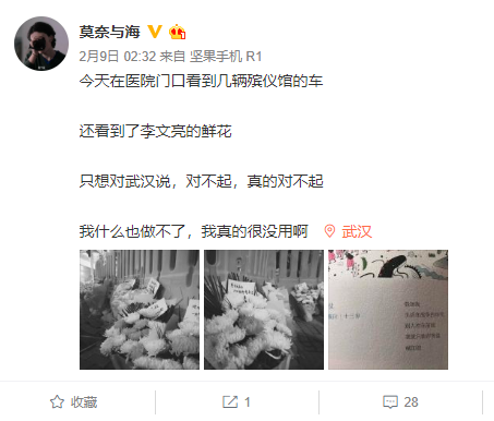 2月8日,他送一个红会志愿者去武汉市中心医院,给李文亮医生献花。他在医院门口看到几辆殡仪馆的车,门诊大门前堆满了花束,连院外围栏也放了一排鲜花在地上,每束花都有一个小纸条,寄托着同一种情绪。