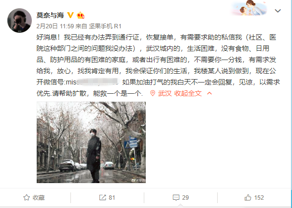 最近很少收到求助信息了。社区开始有限放行,市内交通在逐步恢复,各行各业也在陆续复工。这意味着,武汉已经不太需要他这样的志愿者了。
