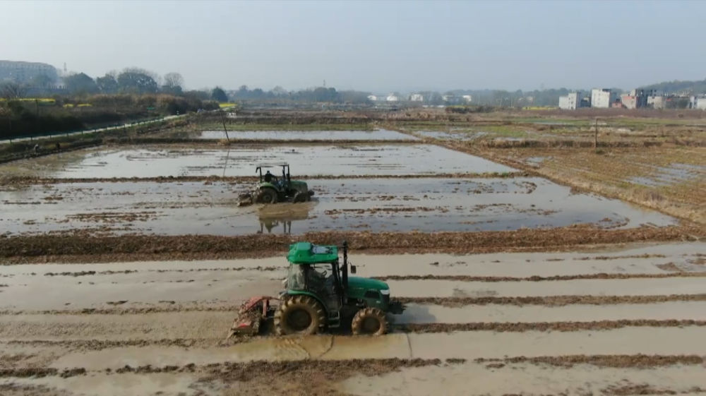 在江西省九江市柴桑区狮子街道龙岗村,种粮大户闫正东正在进行早稻田翻耕。(受访者供图)