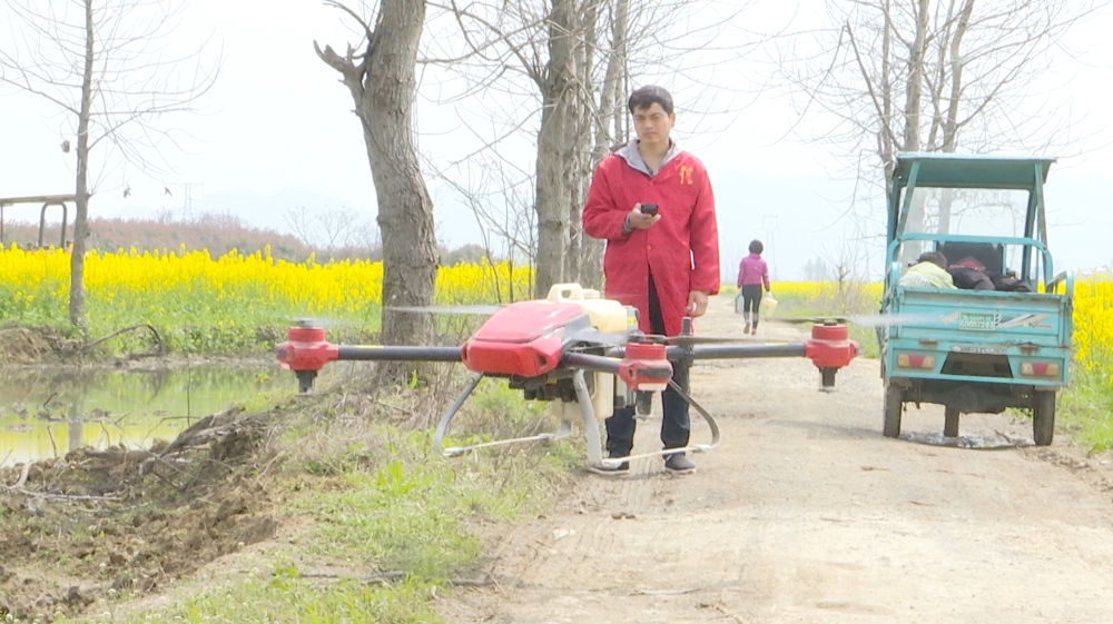 在柴桑区曹氏家庭农场,农场主曹敬民正熟练地操作植保无人机。曹敬民告诉记者,这次疫情对农场生产影响较小,通过政府信息化平台和农技专家的帮扶支持,对今年农场增收充满信心。