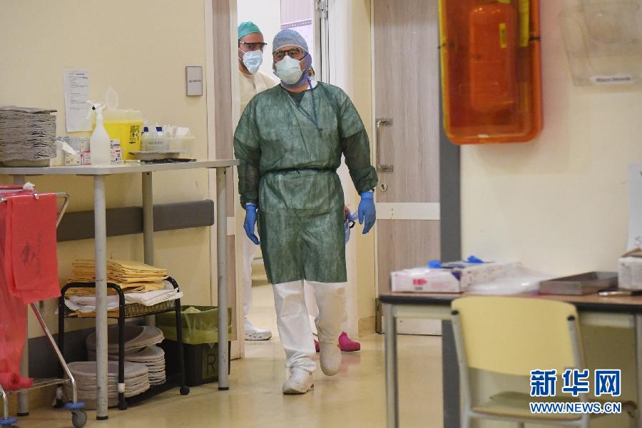 4月9日,在意大利博洛尼亚,医护人员在圣奥尔索拉—马尔皮吉医院工作。 新华社发(詹尼·斯基基摄)