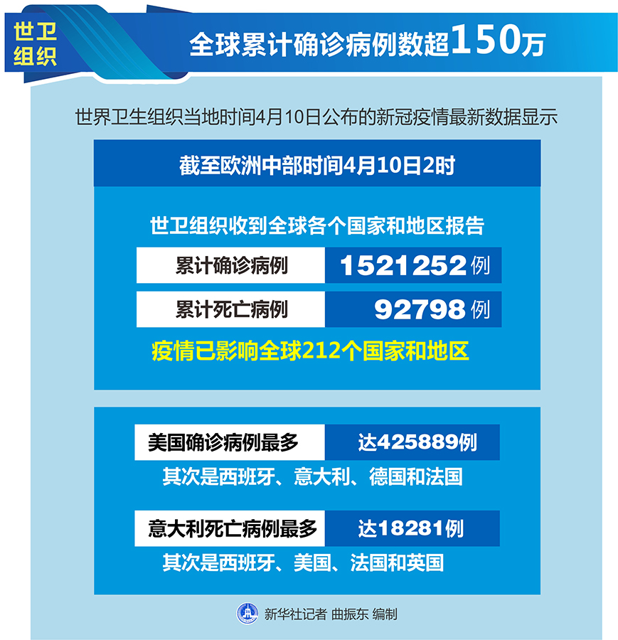 新华社日内瓦4月10日电(记者刘曲)世界卫生组织10日公布的新冠疫情最新数据显示,全球累计确诊病例数已超过150万。