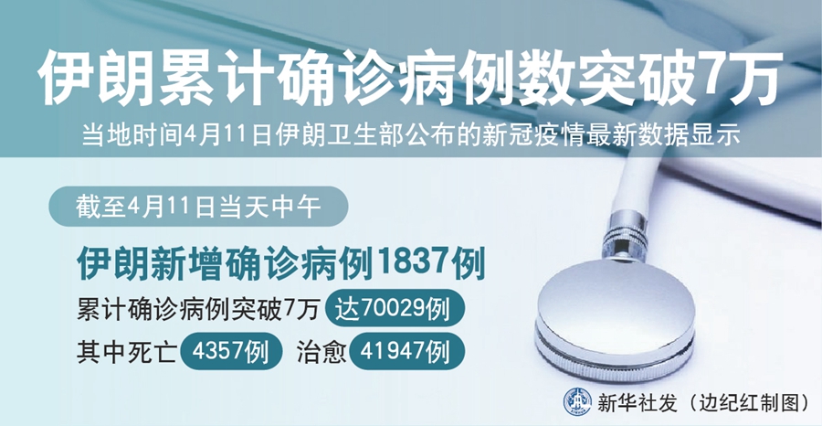 新华社德黑兰4月11日电(记者陈霖)伊朗卫生部11日公布的新冠疫情最新数据显示,截至当天中午,伊朗新增确诊病例1837例,累计确诊病例突破7万,达70029例,其中死亡4357例,重症3987例,治愈41947例。