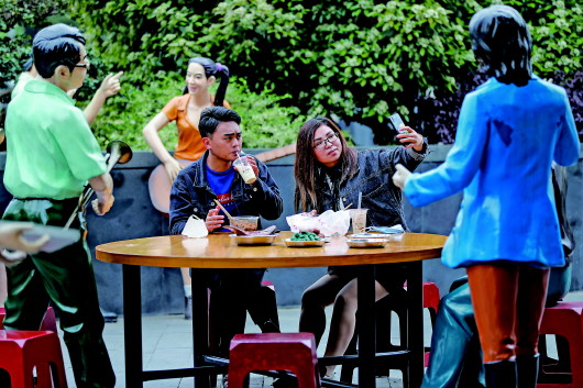 4月5日,人们在武汉市吉庆街的“大排档”雕塑旁吃热干面。 新华社记者沈伯韩摄