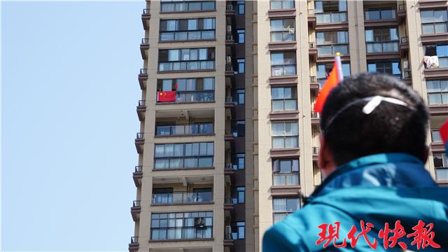 居民窗边挂五星红旗送行