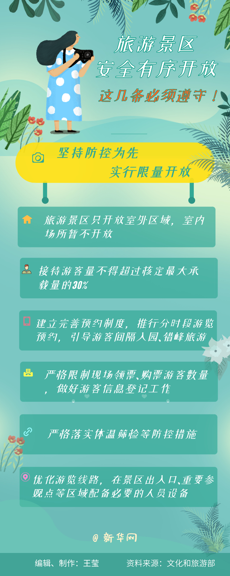 近日,一些旅游景区在恢复开放期间出现大量游客聚集拥挤现象,增加了疫情传播风险,为严格规范解禁后旅游景区管理,确保旅游景区安全有序开放,经国务院应对新型冠状病毒感染肺炎疫情联防联控机制同意,文化和旅游部、国家卫生健康委日前联合印发《关于做好旅游景区疫情防控和安全有序开放工作的通知》。通知对旅游景区安全有序开放做出明确规范,一起了解。