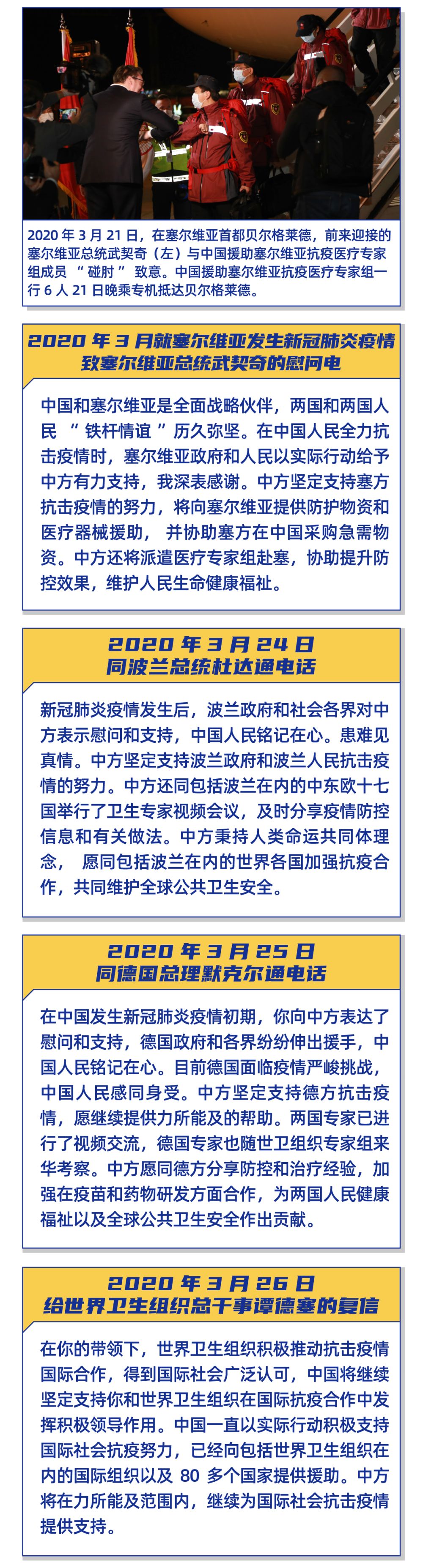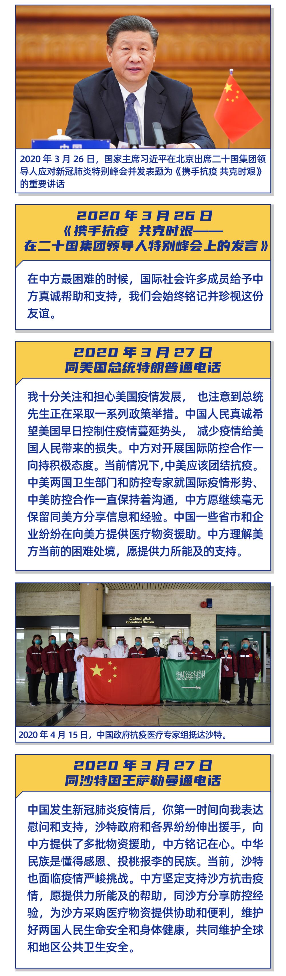 4月16日出版的第8期《求是》杂志发表中共中央总书记、国家主席、中央军委主席习近平的重要文章《团结合作是国际社会战胜疫情最有力武器》。文章第三专题着重强调:患难见真情,中方赞赏国际社会给予我们的宝贵理解和支持,中国人民铭记在心,中华民族是懂得感恩、投桃报李的民族,中方始终在力所能及范围内为国际社会抗击疫情提供支持。