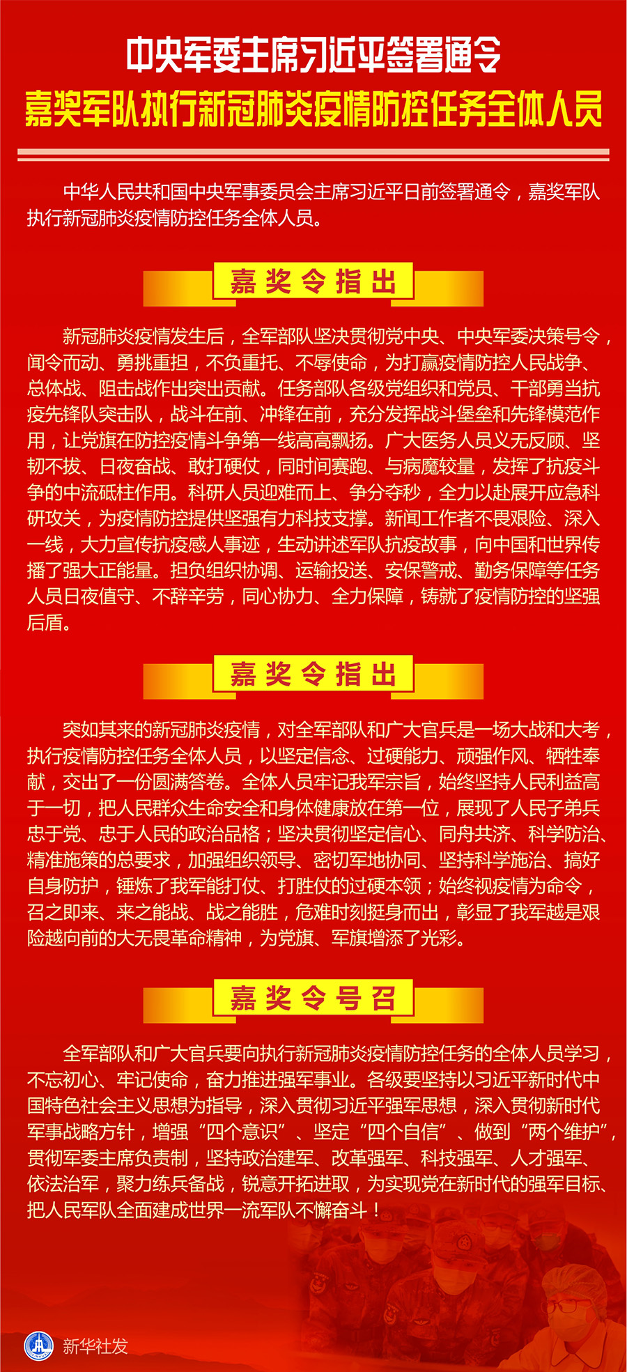 嘉奖令指出,突如其来的新冠肺炎疫情,对全军部队和广大官兵是一场大战和大考,执行疫情防控任务全体人员,以坚定信念、过硬能力、顽强作风、牺牲奉献,交出了一份圆满答卷。全体人员牢记我军宗旨,始终坚持人民利益高于一切,把人民群众生命安全和身体健康放在第一位,展现了人民子弟兵忠于党、忠于人民的政治品格;坚决贯彻坚定信心、同舟共济、科学防治、精准施策的总要求,加强组织领导、密切军地协同、坚持科学施治、搞好自身防护,锤炼了我军能打仗、打胜仗的过硬本领;始终视疫情为命令,召之即来、来之能战、战之能胜,危难时刻挺身而出,彰显了我军越是艰险越向前的大无畏革命精神,为党旗、军旗增添了光彩。