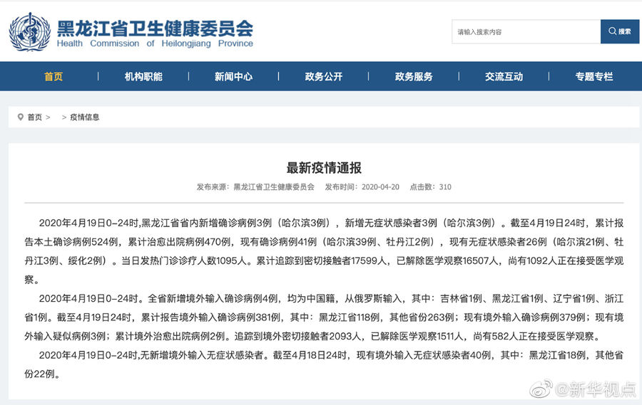 2020年4月19日0-24时,黑龙江省省内新增确诊病例3例(哈尔滨3例),新增无症状感染者3例(哈尔滨3例)。截至4月19日24时,累计报告本土确诊病例524例,累计治愈出院病例470例,现有确诊病例41例(哈尔滨39例、牡丹江2例),现有无症状感染者26例(哈尔滨21例、牡丹江3例、绥化2例)。当日发热门诊诊疗人数1095人。累计追踪到密切接触者17599人,已解除医学观察16507人,尚有1092人正在接受医学观察。