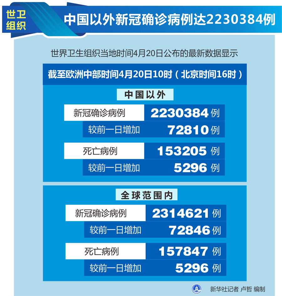 新华社日内瓦4月20日电(记者刘曲)世界卫生组织20日公布的最新数据显示,中国以外新冠确诊病例达到2230384例。