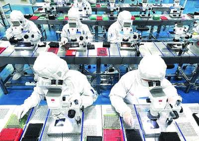 江苏连云港海州经济开发区内一公司,工人正在加紧生产一批海外企业配套的手机摄像头产品。耿玉和摄/光明图片