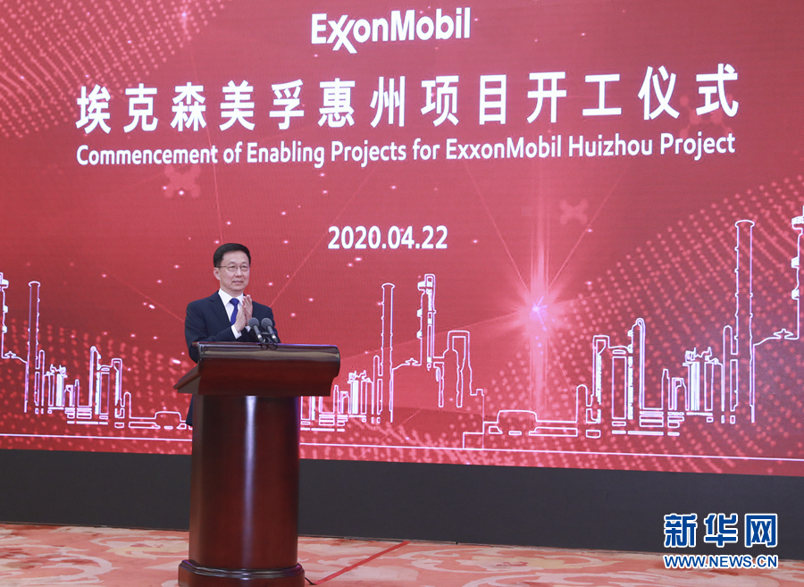 4月22日,埃克森美孚在粤港澳大湾区投资建设的广东惠州乙烯项目举行“云开工”仪式。中共中央政治局常委、国务院副总理韩正出席并宣布项目开工。 新华社记者 丁林 摄