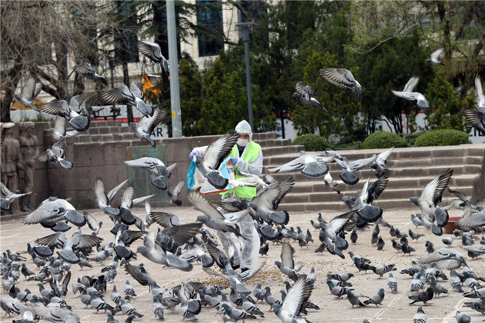 4月11日,土耳其首都、第二大城市安卡拉首度实施周末“居家令”时,政府工作人员给鸽子喂食 。新华社发(穆斯塔法·卡亚摄)
