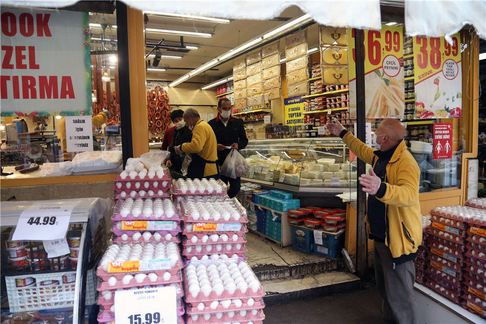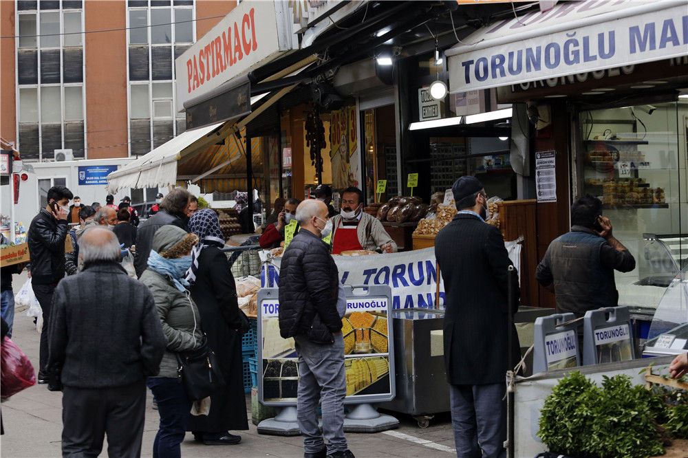 4月22日,安卡拉市民在购物,几乎都戴了口罩。新华社发(穆斯塔法·卡亚摄)
