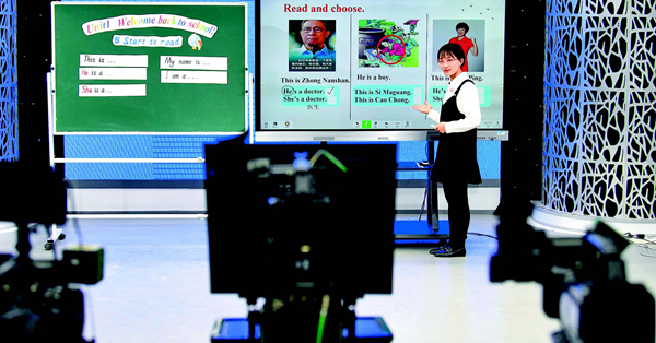 2月17日,宁夏银川市金凤区实验小学教师杨玉燕在录制“空中课堂”四年级英语课程 冯开华摄