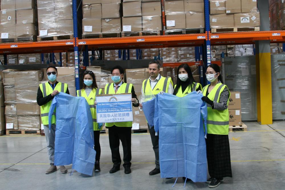 2020年4月20日,英国华侨华人社团向英方捐赠医用防护服。(新华社发)