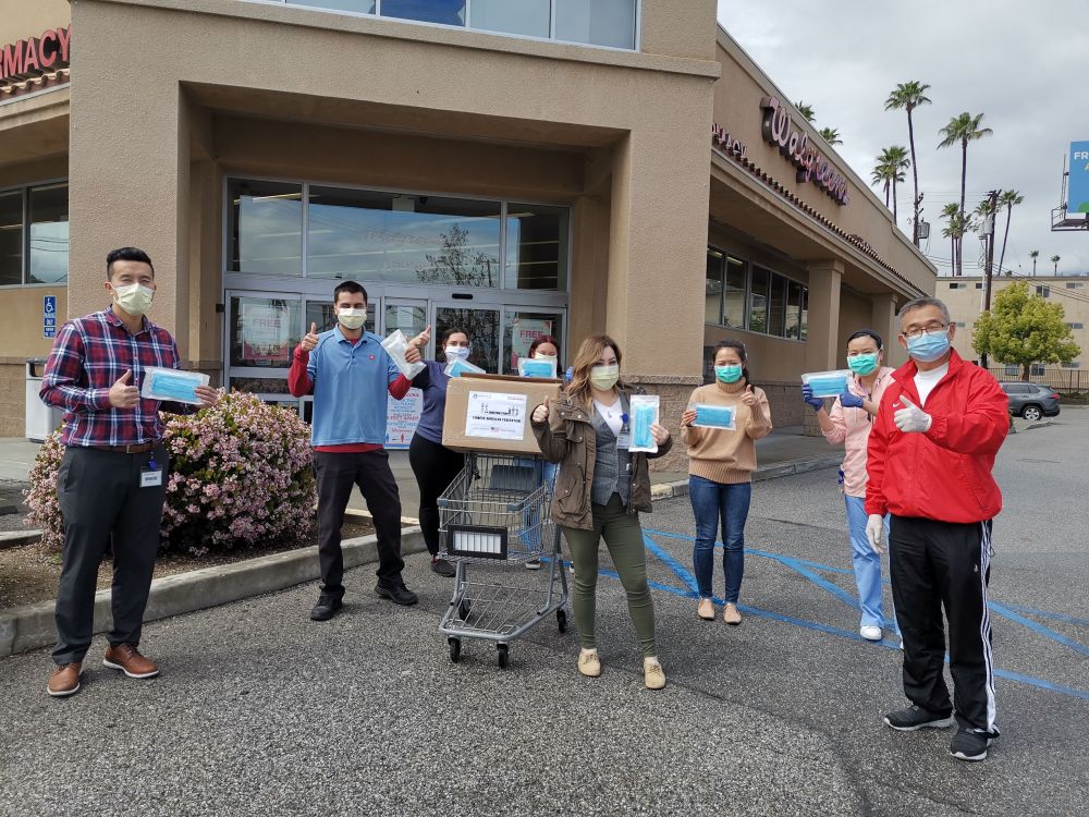 2020年4月7日,在美国洛杉矶县天普市,美国南加州华人联合总会代表向当地一家药店捐赠口罩时合影。(新华社发)