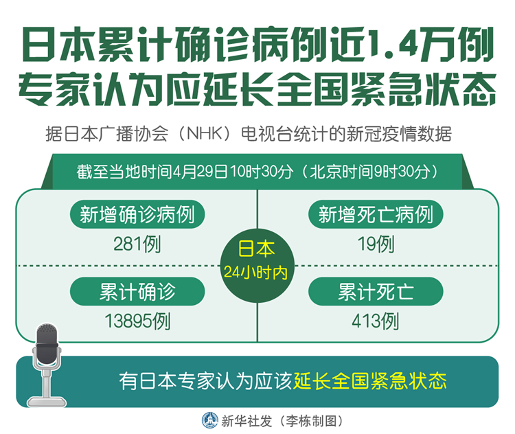 新华社东京4月29日电(记者华义)据日本广播协会(NHK)电视台统计的新冠疫情数据,截至29日10时30分(北京时间9时30分),日本24小时内新增确诊病例281例,累计确诊13895例;新增死亡病例19例,累计死亡413例。有日本专家认为应该延长全国紧急状态。