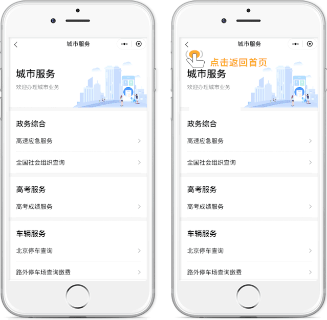城市服务还会根据定位城市,为你智能化推荐当地的实用功能,如停车查询、汽车售票、举报中心等服务,让你的出行更省心。(如定位有误可在首页左上角进行切换。)