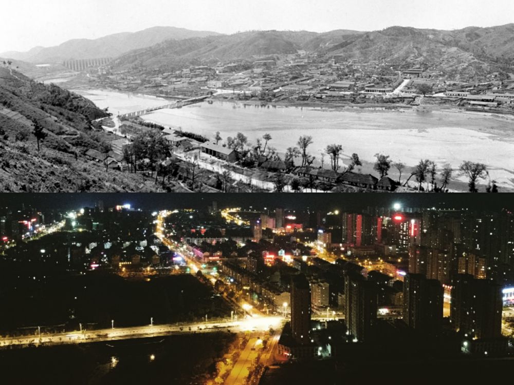 (上图:1961年金寨县城,新华社记者吴乙明、张幼良摄;下图:2020年金寨县城夜景。新华社记者陈诺摄)