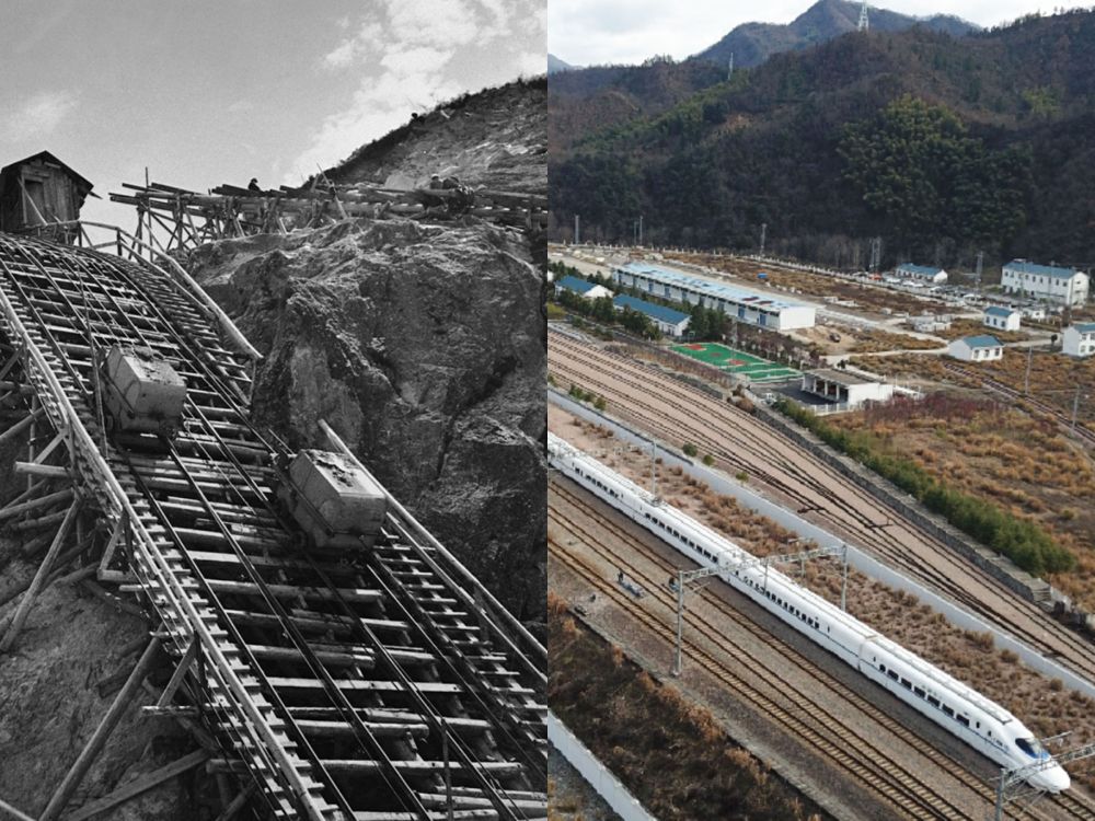 (左图:1957年金寨响洪甸水库工地上吊车运送混凝土,新华社稿王永嘉摄;右图:2019年高铁驶出金寨火车站。新华社记者张端摄)