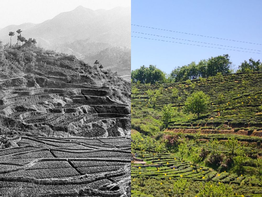 (左图:1957年金寨的梯田,新华社稿张斌摄;右图:2019年金寨的茶园。新华社记者陈诺摄)