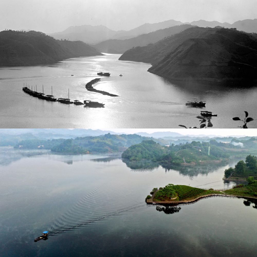 (上图:1976年金寨的水库,新华社记者成大林摄;下图:2019年水库之上是茶谷。新华社记者陶明摄)