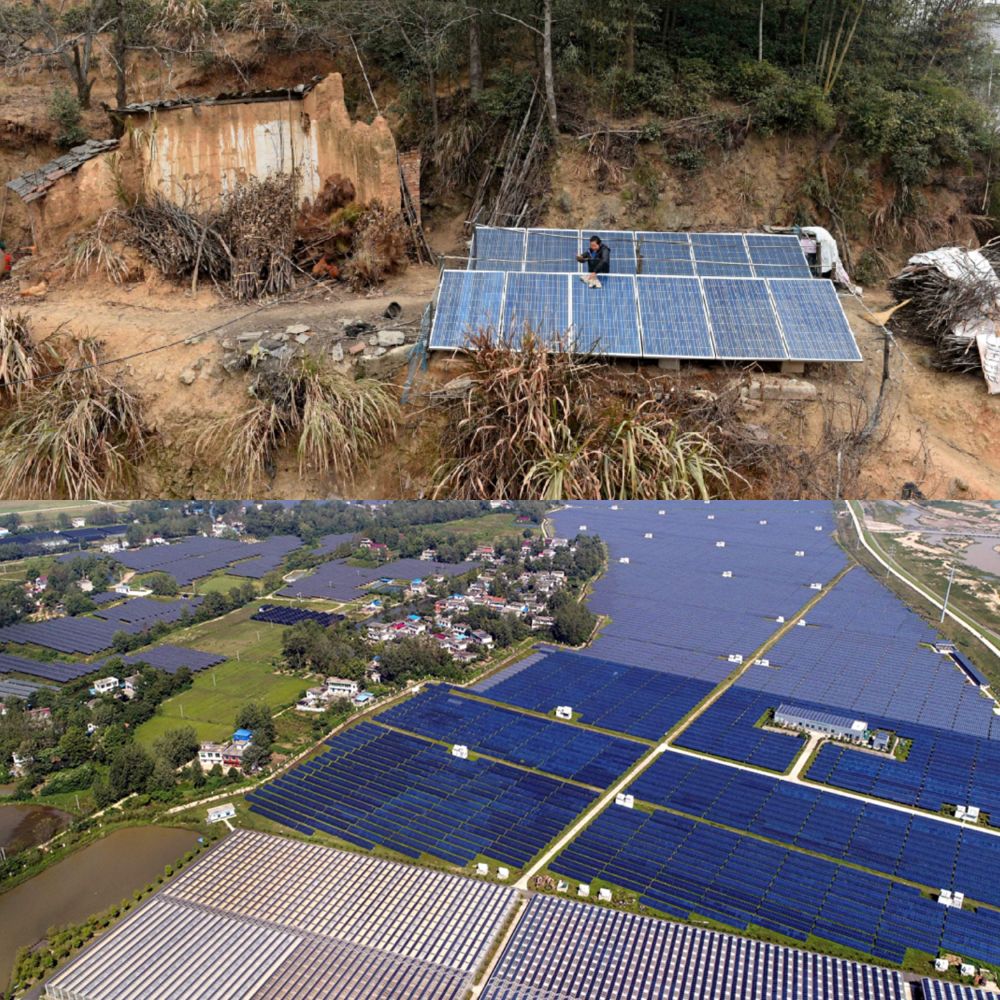 (上图:2015年1月28日,金寨县全军乡沙河店村村民在擦拭自家后院的光伏发电板,新华社记者刘军喜摄;下图:2017年9月14日,金寨县小南京光伏农业生态园全景。新华社记者陶明摄)