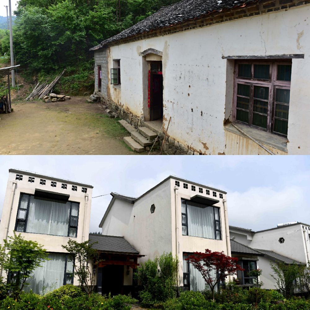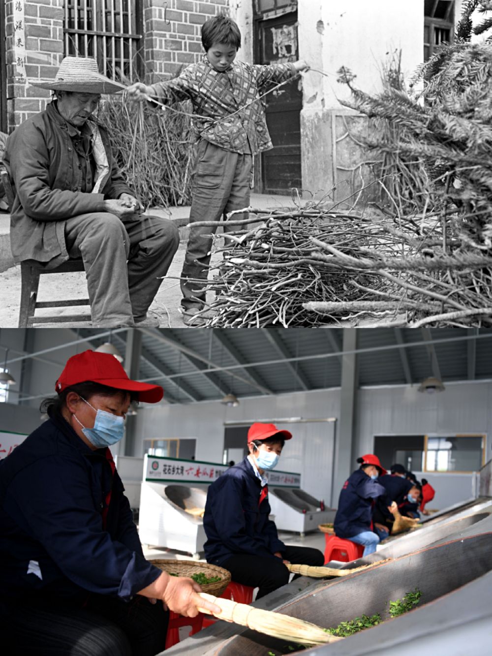 (上图:过去金寨人守着柴火过日子,新华社记者张曙光摄;下图:2020年4月16日,大湾村村民在金寨县花石乡茶产业扶贫车间里加工茶叶。新华社记者刘军喜摄)