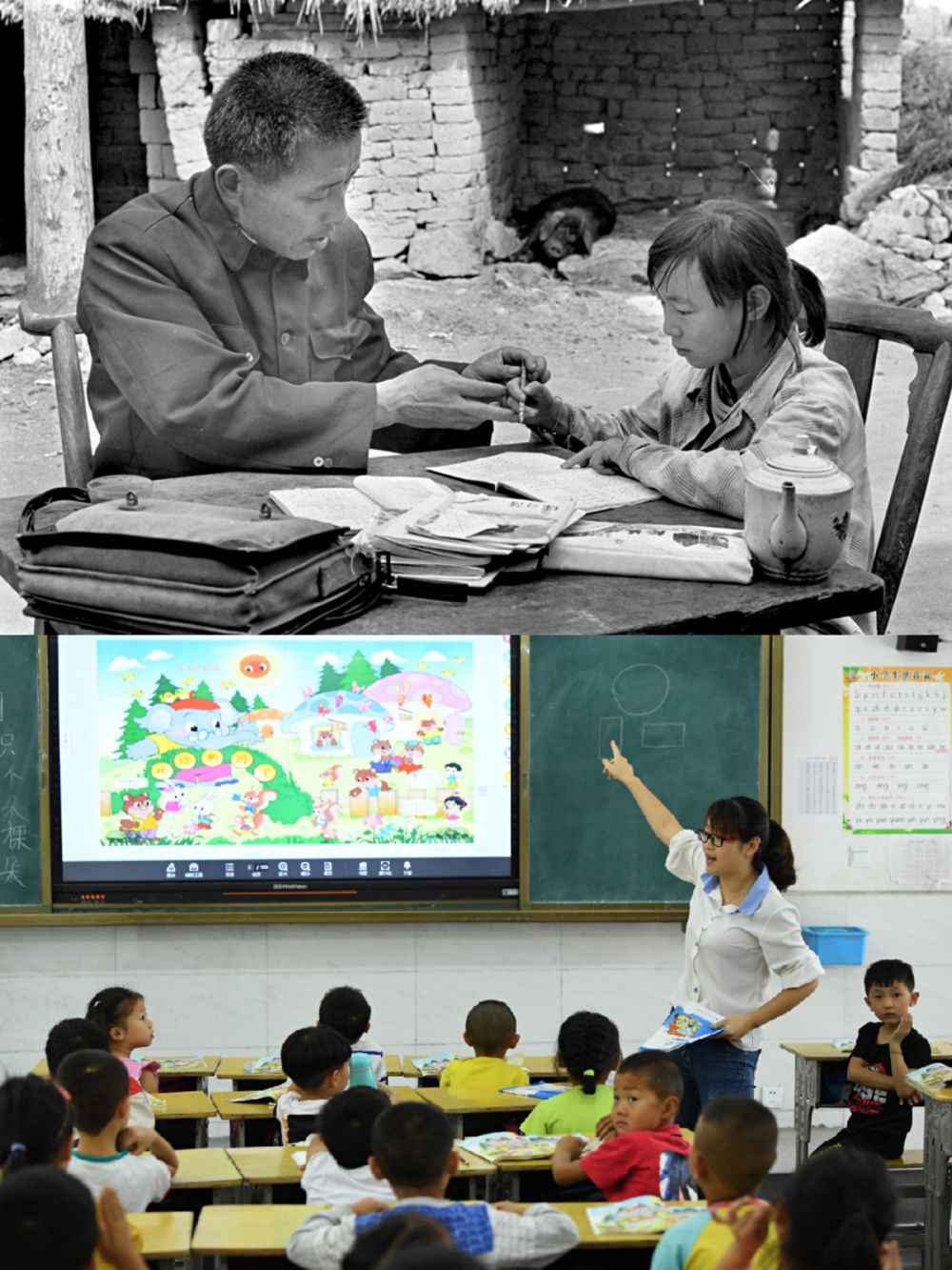 (上图:1991年5月,金寨县希望小学老师胡遵训跑20多里山路为学生胡亚丽补课,新华社记者张曙光摄;下图:2019年9月3日,金寨县希望小学南校区学生通过多媒体上课。新华社记者刘军喜摄)