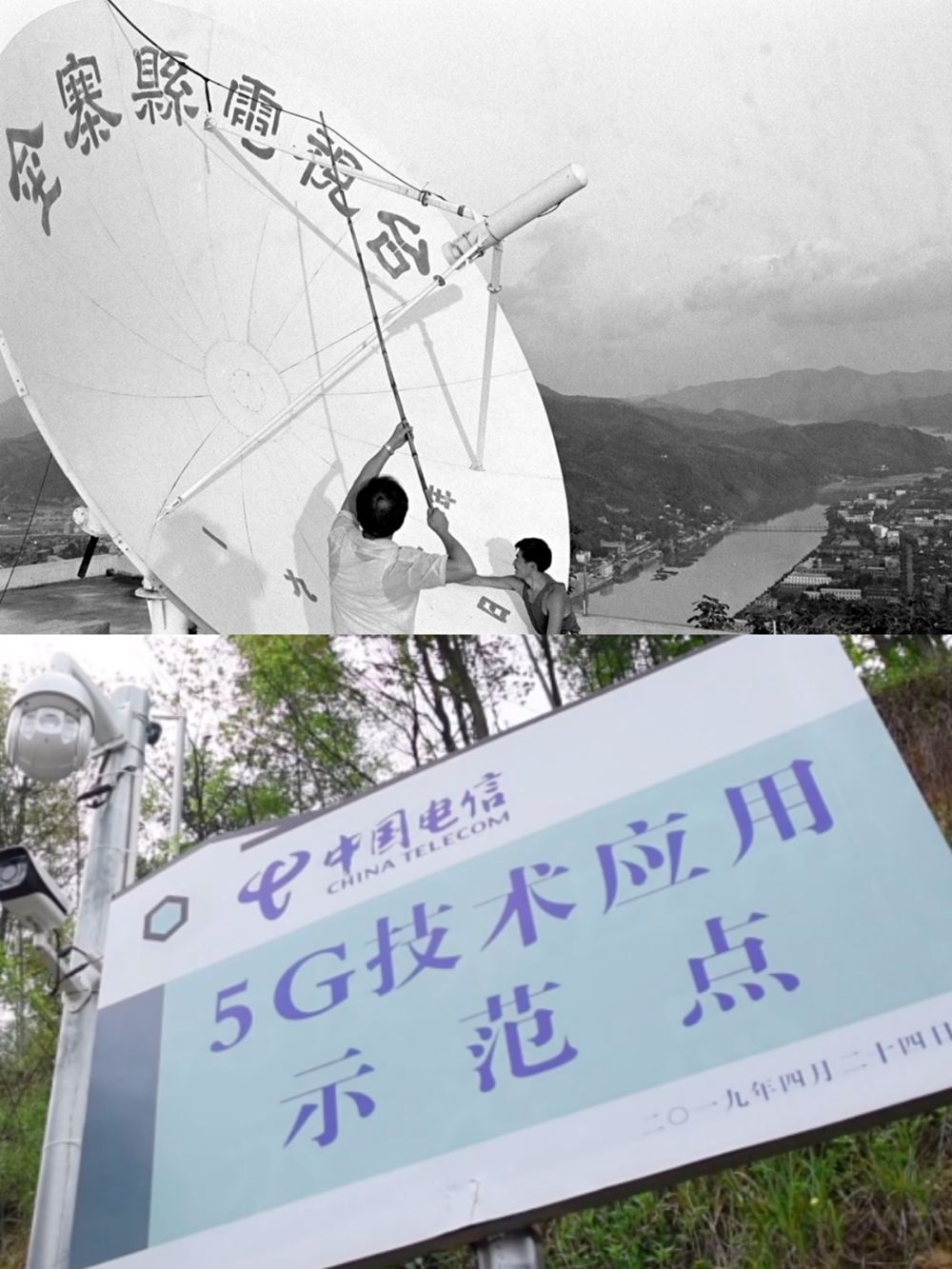 (上图:1987年,金寨县建成梅山地面卫星接收站,新华社记者李锦摄;2019年,大湾村开通5G信号。新华社记者汤阳摄)