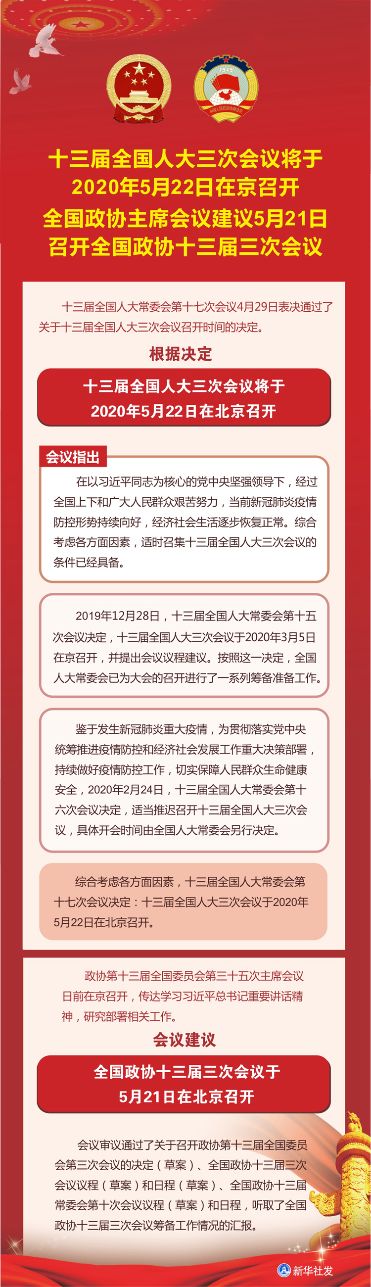 图表:十三届全国人大三次会议将于2020年5月22日在京召开 全国政协主席会议建议5月21日召开全国政协十三届三次会议 新华社发