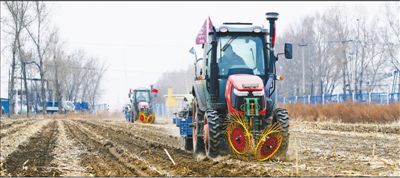 今年备春耕,吉林省农安县哈拉海镇创业村农民杨守奎带领合作社五十来户农民,开着拖拉机,拖挂上埋管机器,把两指多宽的黑色滴灌胶管埋进垄里。