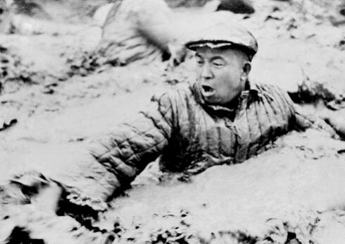 铁人王进喜用血肉之躯奋力搅拌泥浆(资料照片)。