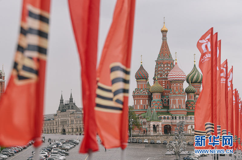 5月4日,在俄罗斯首都莫斯科,红场附近道路装饰着庆祝胜利日的旗帜。俄罗斯总统普京4月16日宣布,因新冠疫情俄将推迟原定于5月9日举办的俄纪念卫国战争胜利75周年阅兵式。 为遏制新冠疫情蔓延,3月30日起莫斯科和俄多城实施居家隔离制度。 新华社发(叶甫盖尼·西尼岑摄)
