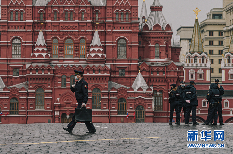 5月4日,一名警察(左)经过俄罗斯莫斯科红场。 为遏制新冠疫情蔓延,3月30日起莫斯科和俄多城实施居家隔离制度。 新华社发(叶甫盖尼·西尼岑摄)