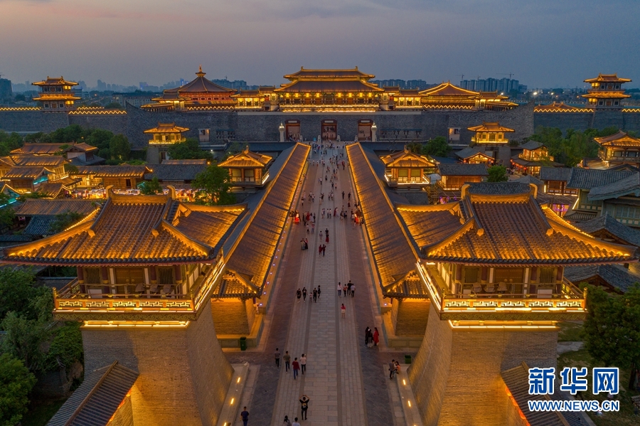 5月1日,游客在湖北省襄阳市唐城景区观赏夜景(无人机照片)。 新华社发(杨东 摄)