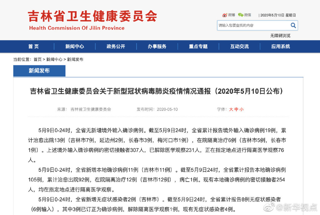 5月9日0-24时,全省新增本地确诊病例11例(吉林市11例)。截至5月9日24时,全省累计报告本地确诊病例105例,累计治愈出院92例,在院隔离治疗12例(吉林市12例),病亡1例。现有本地确诊病例的密切接触者254人,均在指定地点进行隔离医学观察。