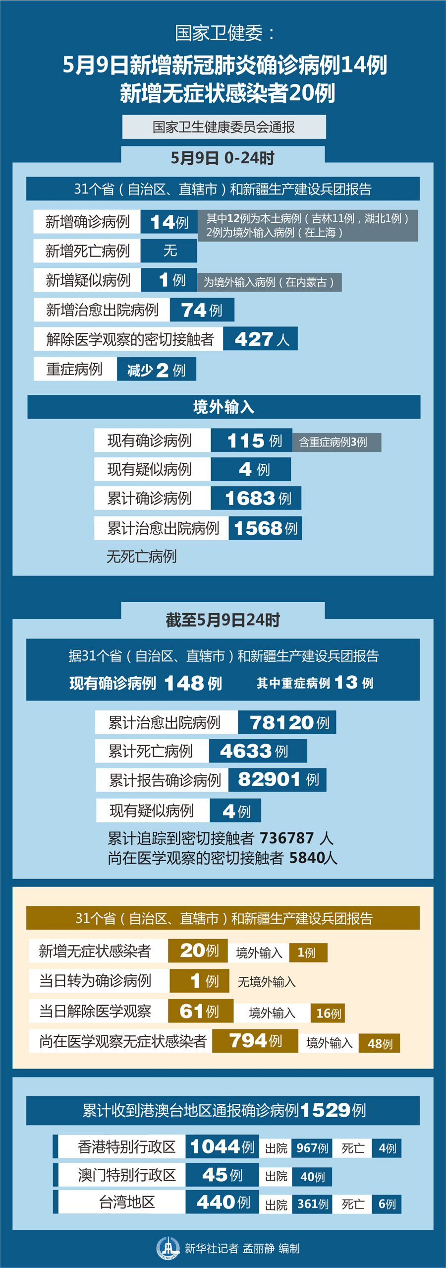 新华社北京5月10日电(记者陈聪)国家卫生健康委员会10日通报,5月9日0—24时,31个省(自治区、直辖市)和新疆生产建设兵团报告新增新冠肺炎确诊病例14例,其中12例为本土病例(吉林11例,湖北1例),2例为境外输入病例(在上海);无新增死亡病例;新增疑似病例1例,为境外输入病例(在内蒙古)。