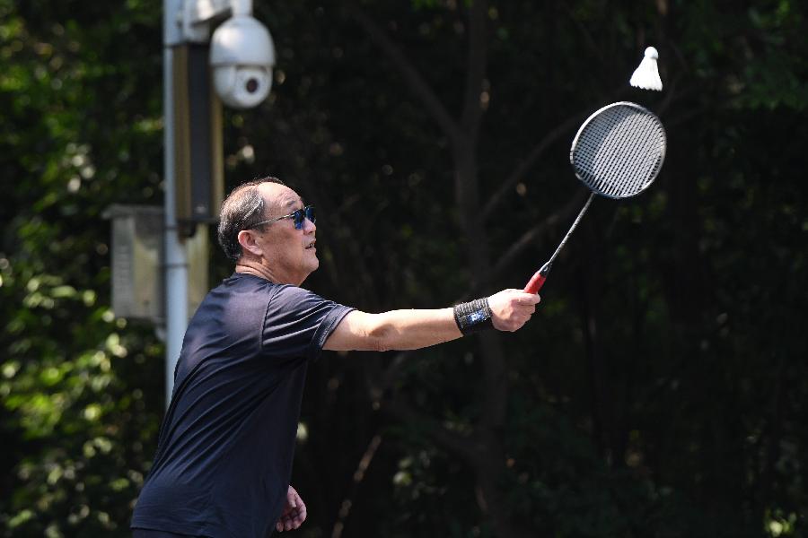 5月3日,一位市民在合肥市环城公园内打羽毛球。 当日是“五一”假期第三天,合肥市民纷纷来到户外,健身休闲,乐享假期。 新华社记者 张端 摄