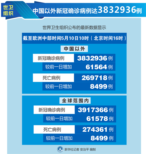 世卫组织每日疫情报告显示,截至欧洲中部时间10日10时(北京时间16时),中国以外新冠确诊病例较前一日增加61564例,达到3832936例;中国以外死亡病例较前一日增加8499例,达到269718例。