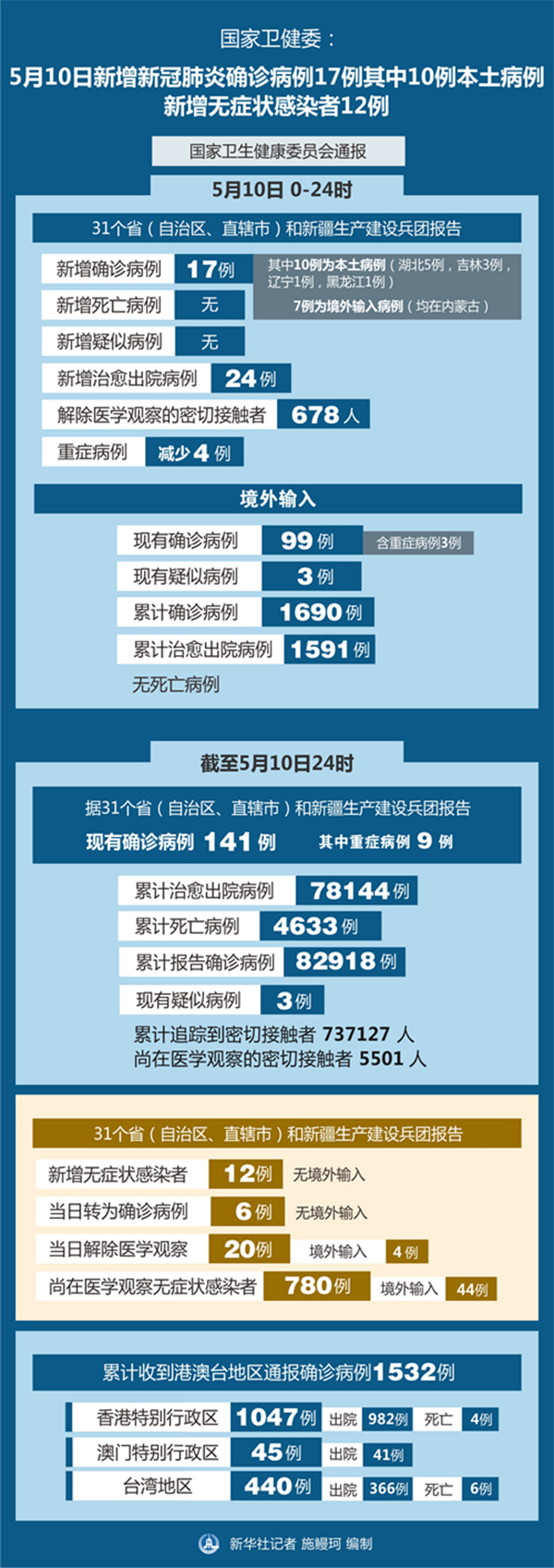 新华社北京5月11日电(记者屈婷)国家卫生健康委员会11日通报,5月10日0-24时,31个省(自治区、直辖市)和新疆生产建设兵团报告新增新冠肺炎确诊病例17例,其中10例为本土病例(湖北5例,吉林3例,辽宁1例,黑龙江1例),7例为境外输入病例(均在内蒙古);无新增死亡病例;无新增疑似病例。