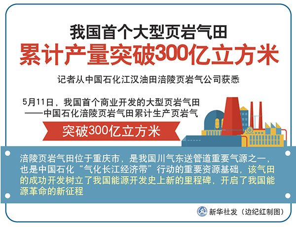 新华社重庆5月11日电(记者陶冶)记者从中国石化江汉油田涪陵页岩气公司获悉,5月11日,我国首个商业开发的大型页岩气田——中国石化涪陵页岩气田累计生产页岩气突破300亿立方米。