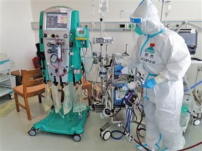 熊杰在隔离病房检查ECOM管路。受访者供图